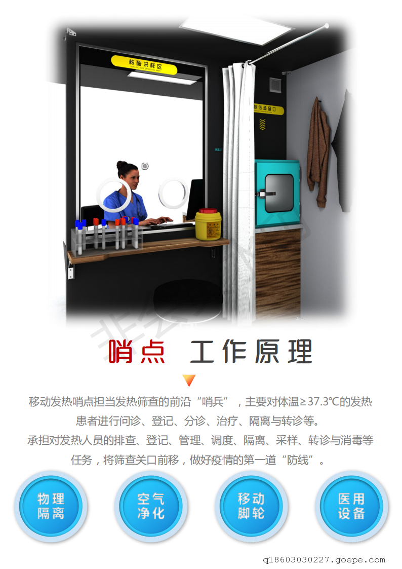 品牌:鸿越 型号:Y-01 加工定制:是 报警模式:移动发热哨点 探测频段:50 MHz 工作范围:40平方 m 工作电压:220 V 外形尺寸:1900*2200*2280 mm 重量:400KG 适用范围:医护人员、患者 移动发热哨点站方舱式临时无菌接触式隔离室