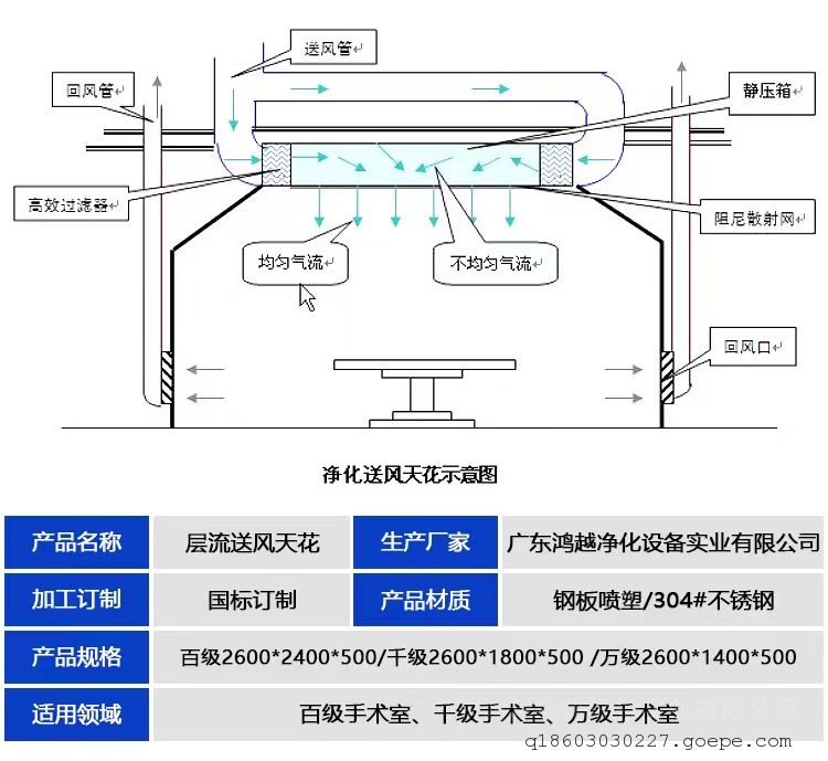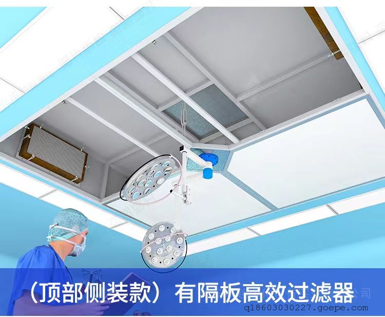 手术室层流天花手术室层流送风天花-洁净送风天花是洁净手术室,层流病房的净化送风末端,它兼有高效过滤,均流及气流补偿作用。层流净化送风天花结构的合理性直接影响到手术室的送风效果,净化级别。广东鸿越净化层流送风天花是近十年来手术室送风末端经验及实践的结晶,该型式末端已得到了近千间手术室的运用证实,其优越的性能,独特的双层DPP均流网能使气流均匀送到工作区域,而中央气流补偿装置,能有效地消除人员、设备发热而产生上升气流对层流的影响。
