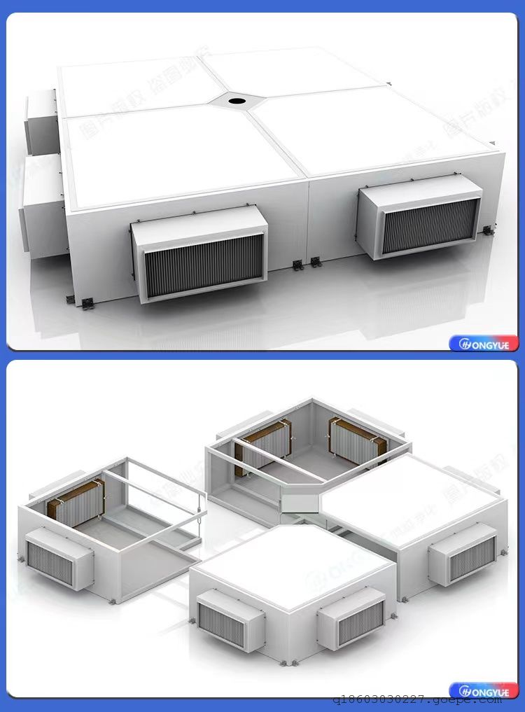 1、A型箱体为冷轧钢板静电喷塑处理,冷轧钢板静电喷塑做围护板及进风过滤框,含双层DPP均流网及中速气流补偿装置。